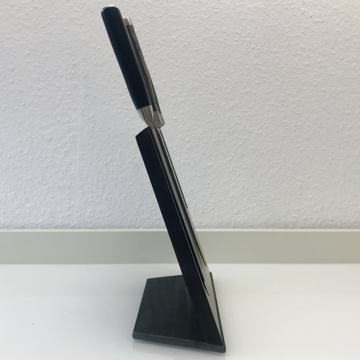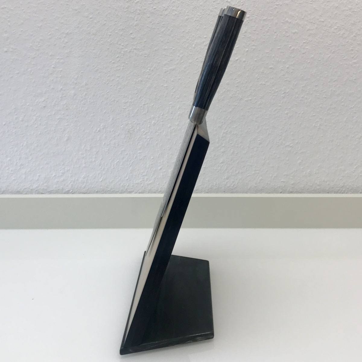 Dieser Block überrascht mit einem Kontrast zwischen den bekannten gelb - orange Tönen und seiner überwiegend dunkelbraunen Farbgebung. Es handelt sich hierbei um Vollholz welches nicht gefügt wurde. Die dunkle Farbgebung wird durch einen Karamelisierungsprozess erzielt, welcher in diesem Fall nicht zu 100% geklappt hat. Sehr zu unserer Freude, denn nur aufgrund dessen konnten wir diesen kontrastreichen Messerblock fertigen. Das elegante und funktionale Design wird durch die dunkle Färbung, die vergleichsweise zarte und an den Kanten abgeschrägte Bambusbohle unterstrichen und durch einen Stahlfuss komlpettiert. Der Block wirkt zart, ist jedoch ein Mittelgewicht, da Bambus sehr dicht ist.