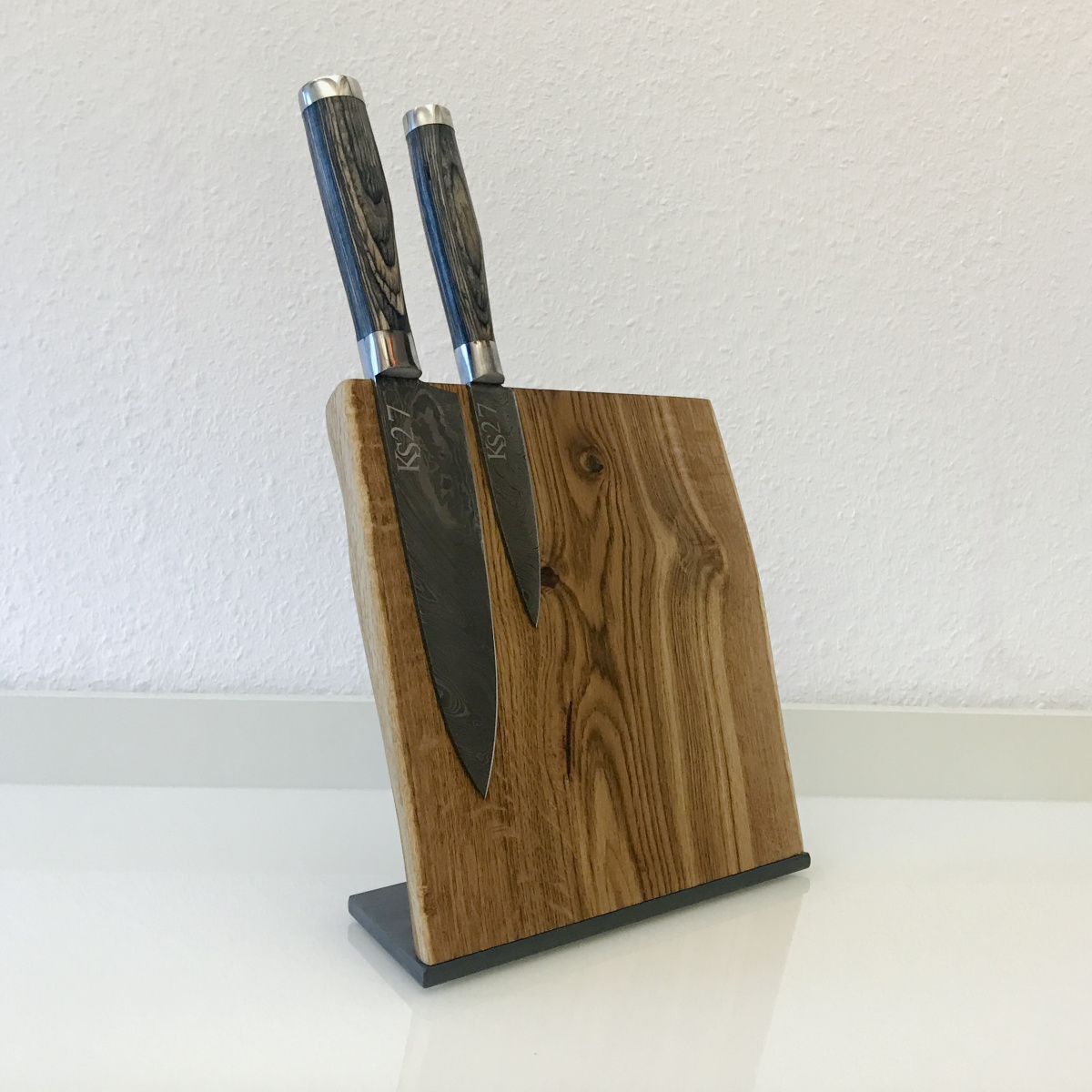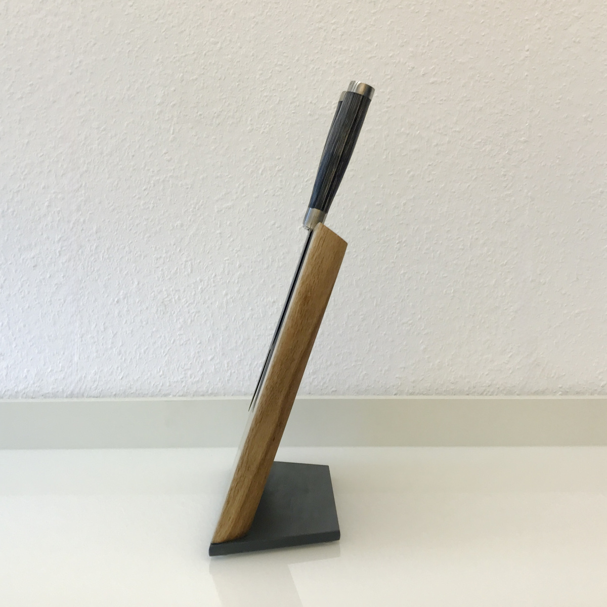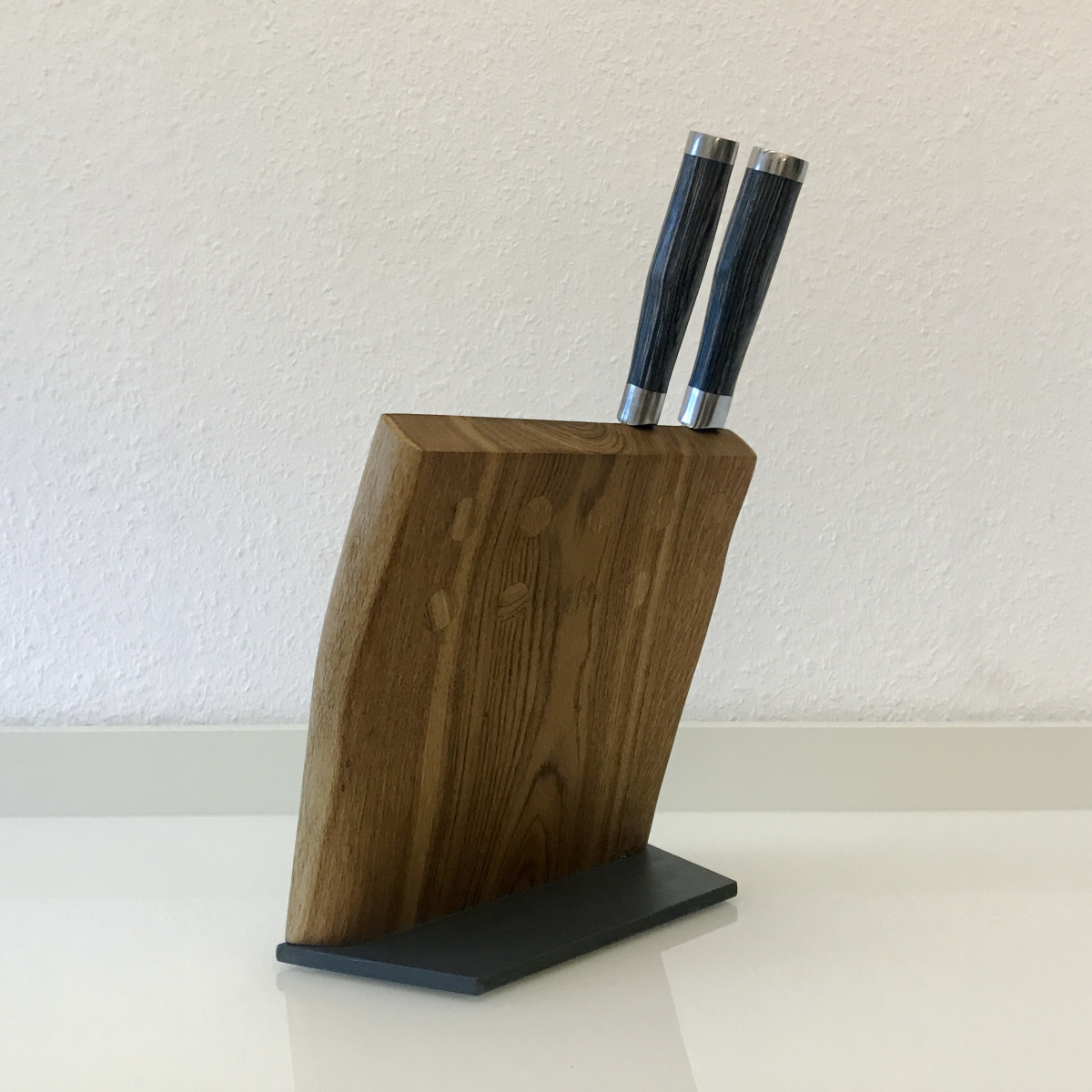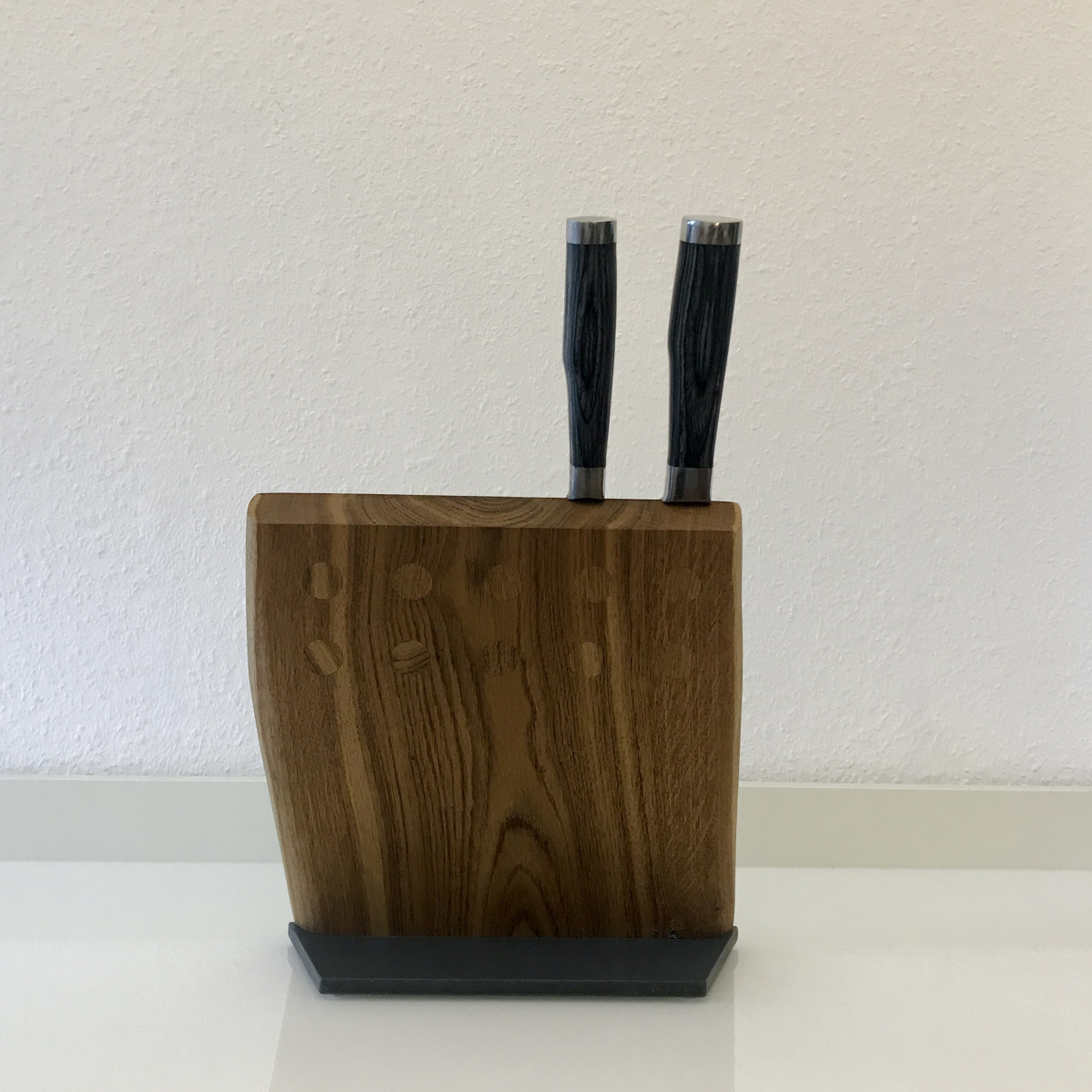 Bis zu 5 Messer. Oberfläche mit Hartwachsöl behandelt. Gummifüße als Schutz. Aufgrund der organischen Form beträgt die Breite des Blockes nicht durchgängig 25cm.