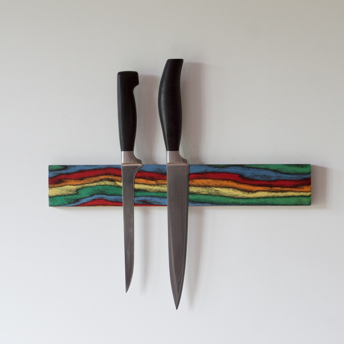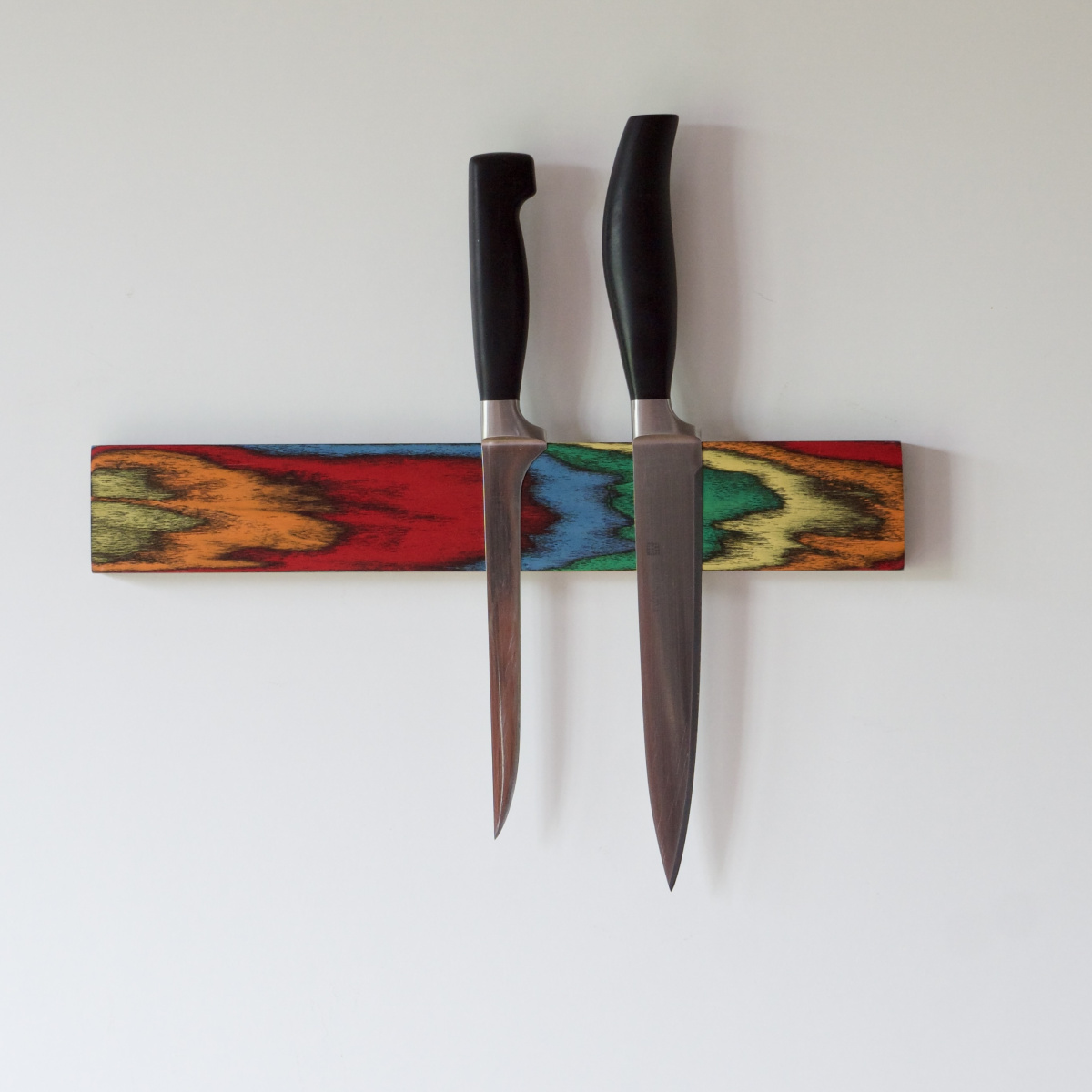 Diese außergewöhnliche Messerleiste wurde aus unserem Designholz PopArt hergestellt – ein Holz aus durchgefärbten Starkfurnieren. In einem aufwendigen Prozess entstehen dabei an die Natur angelehnte Muster, organisch anmutend, aber vom Designer erdacht und farblich ausdrucksstark umgesetzt.