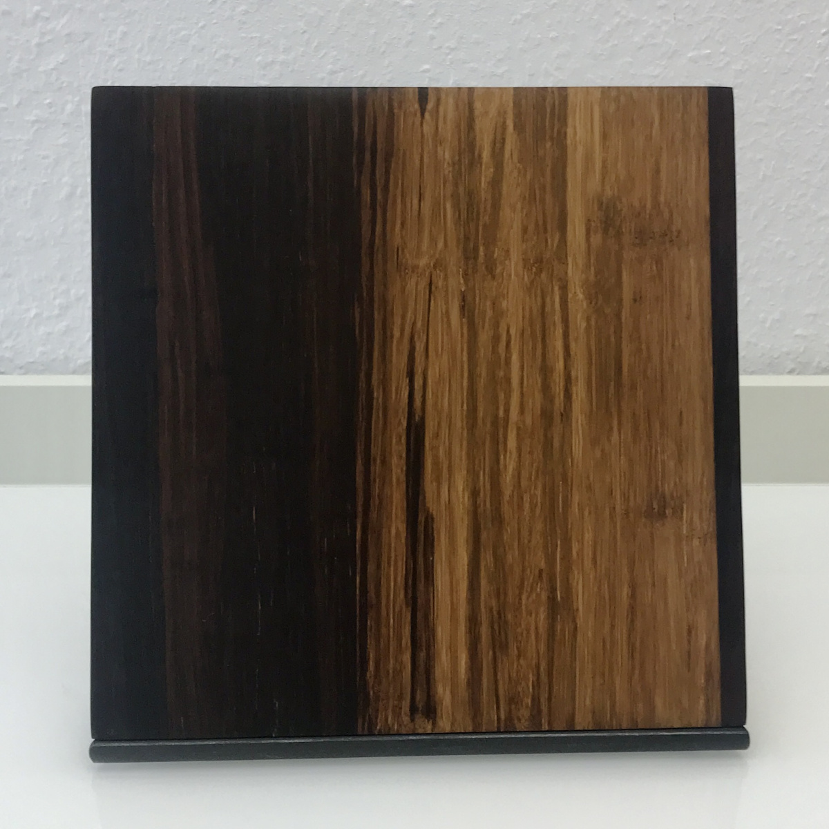 Dieser Block überrascht mit einem Kontrast zwischen den bekannten gelb - orange Tönen und seiner überwiegend dunkelbraunen Farbgebung. Es handelt sich hierbei um Vollholz welches nicht gefügt wurde. Die dunkle Farbgebung wird durch einen Karamelisierungsprozess erzielt, welcher in diesem Fall nicht zu 100% geklappt hat. Sehr zu unserer Freude, denn nur aufgrund dessen konnten wir diesen kontrastreichen Messerblock fertigen. Das elegante und funktionale Design wird durch die dunkle Färbung, die vergleichsweise zarte und an den Kanten abgeschrägte Bambusbohle unterstrichen und durch einen Stahlfuss komlpettiert. Der Block wirkt zart, ist jedoch ein Mittelgewicht, da Bambus sehr dicht ist.