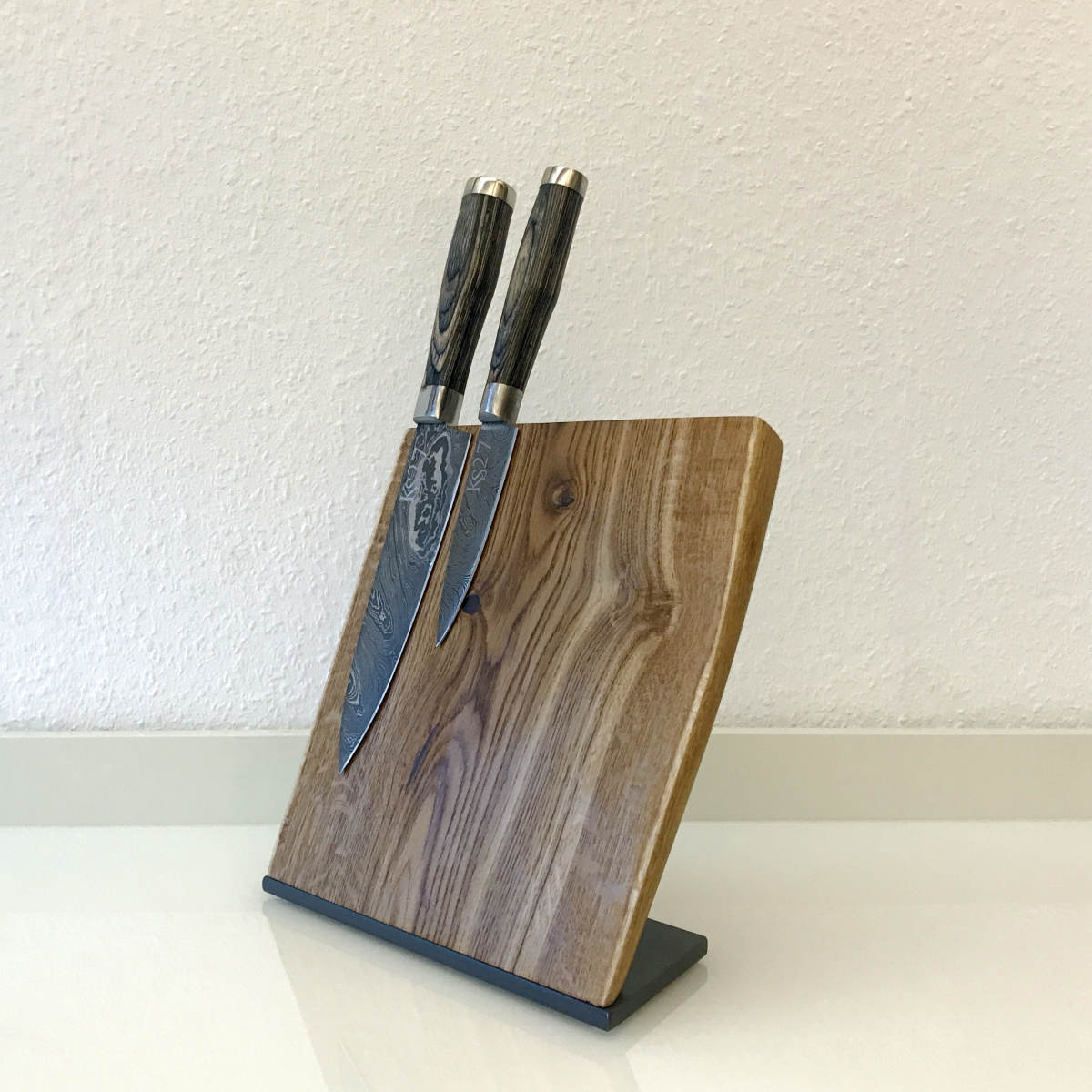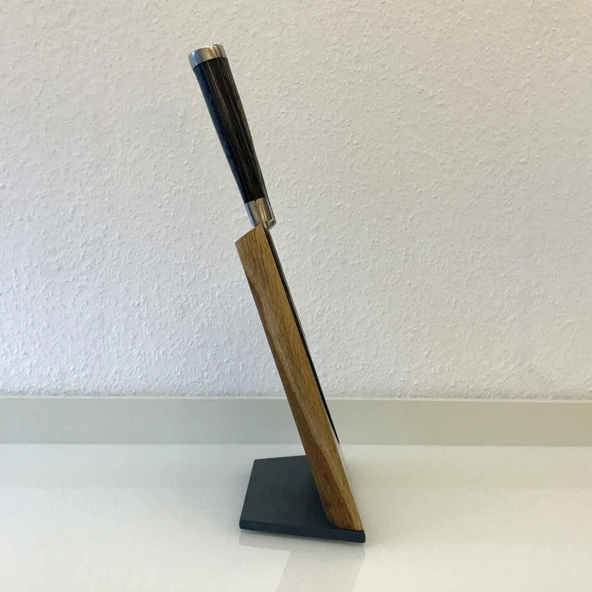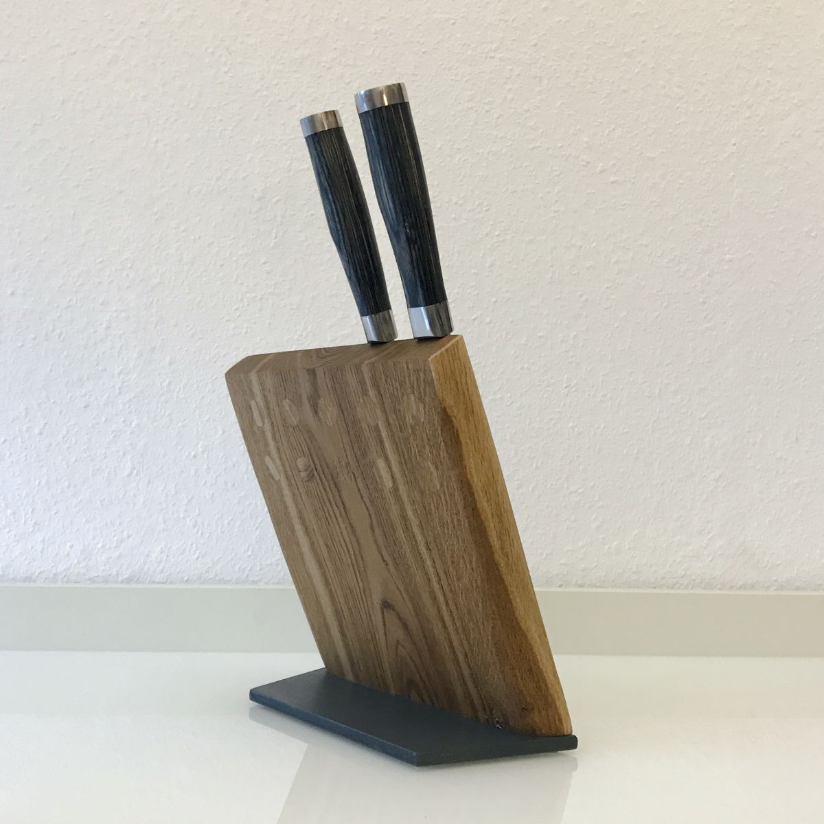 Bis zu 5 Messer. Oberfläche mit Hartwachsöl behandelt. Gummifüße als Schutz. Aufgrund der organischen Form beträgt die Breite des Blockes nicht durchgängig 25cm.