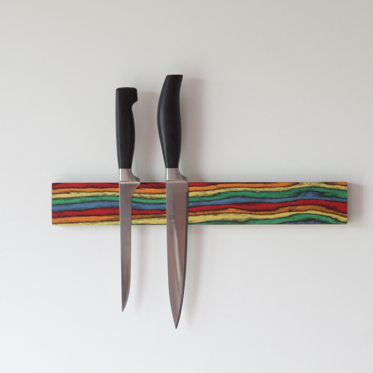Diese außergewöhnliche Messerleiste wurde aus unserem Designholz PopArt hergestellt – ein Holz aus durchgefärbten Starkfurnieren. In einem aufwendigen Prozess entstehen dabei an die Natur angelehnte Muster, organisch anmutend, aber vom Designer erdacht und farblich ausdrucksstark umgesetzt.